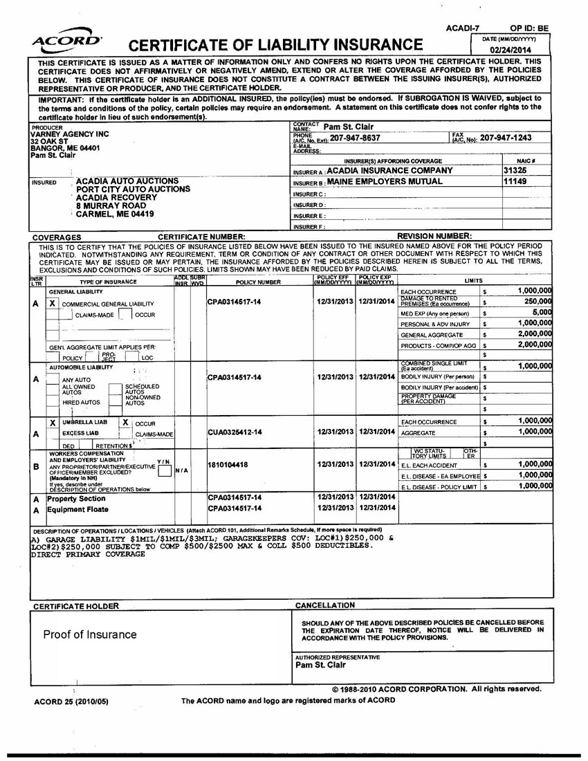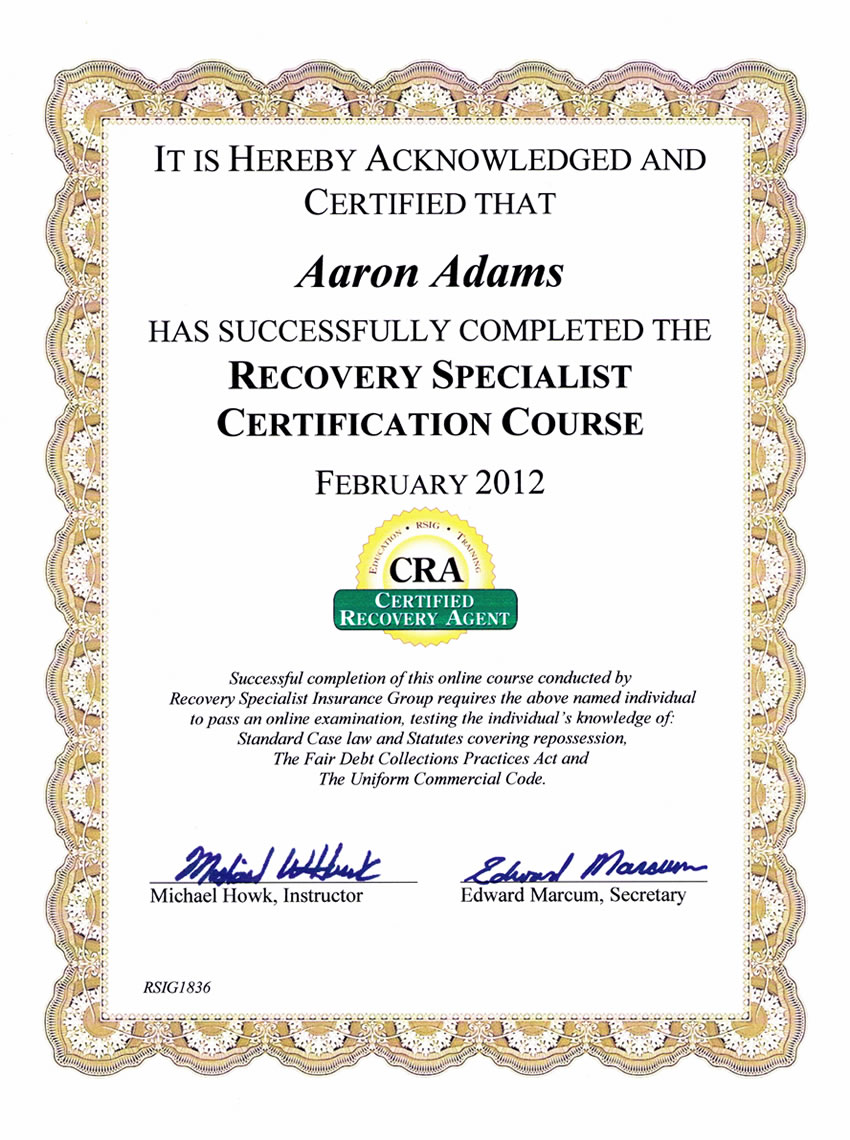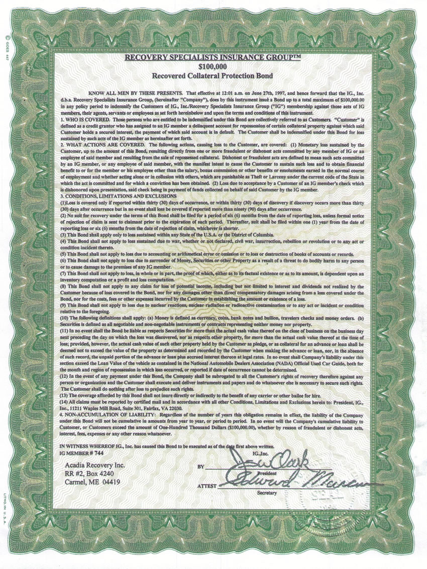 Acadia Recovery, Inc. prides itself on a good reputation and solid insurance and bonding. With $7 million in coverage you can rest assured that we take our job and your business seriously so that you can feel confident when you choose us for your recovery needs. We use the industry leader in insurance, Recovery Specialists Insurance Recovery Group (RSIG), leaving the guess work out of your decision. |